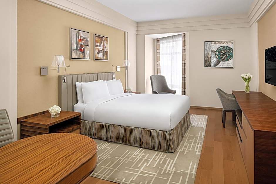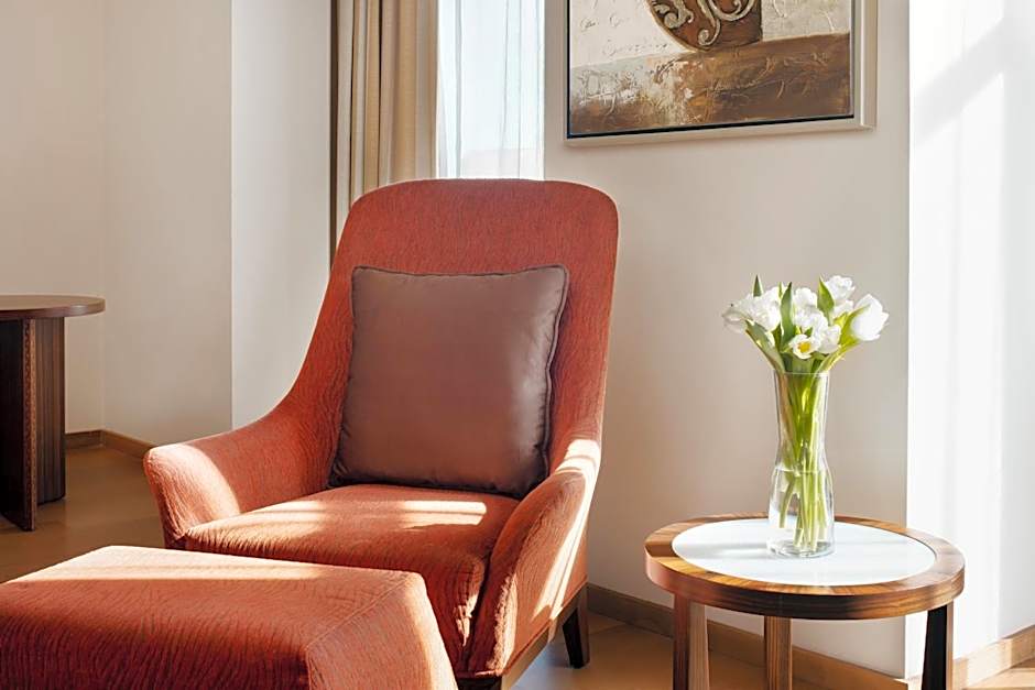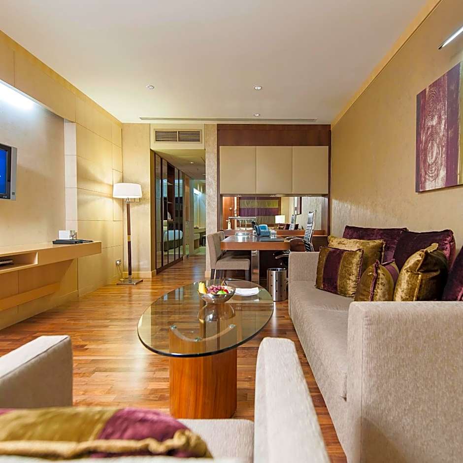 This 54-sqm room features elegant accommodations with a stylish king size bed, a separate living room and a generous bathroom that includes premium amenities and hairdryer. With a functional desk, one may access work with the advantage of direct dial phone, free Wi-Fi Internet connection and satellite LED TV. Also, a safe box and mini-bar with tea and coffee making facilities are provided, complimenting an enjoyable stay.
